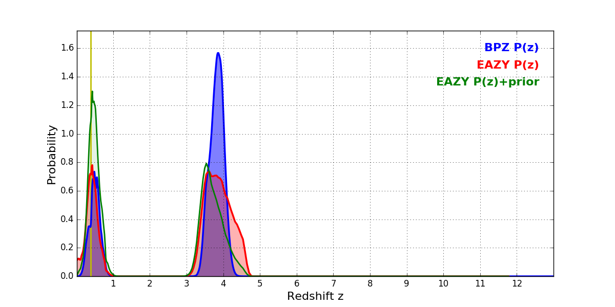 In P(z) plots: Yellow lines mark the cluster redshift z = 0.390,