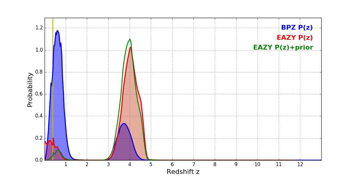 In P(z) plots: Yellow lines mark the cluster redshift z = 0.390,