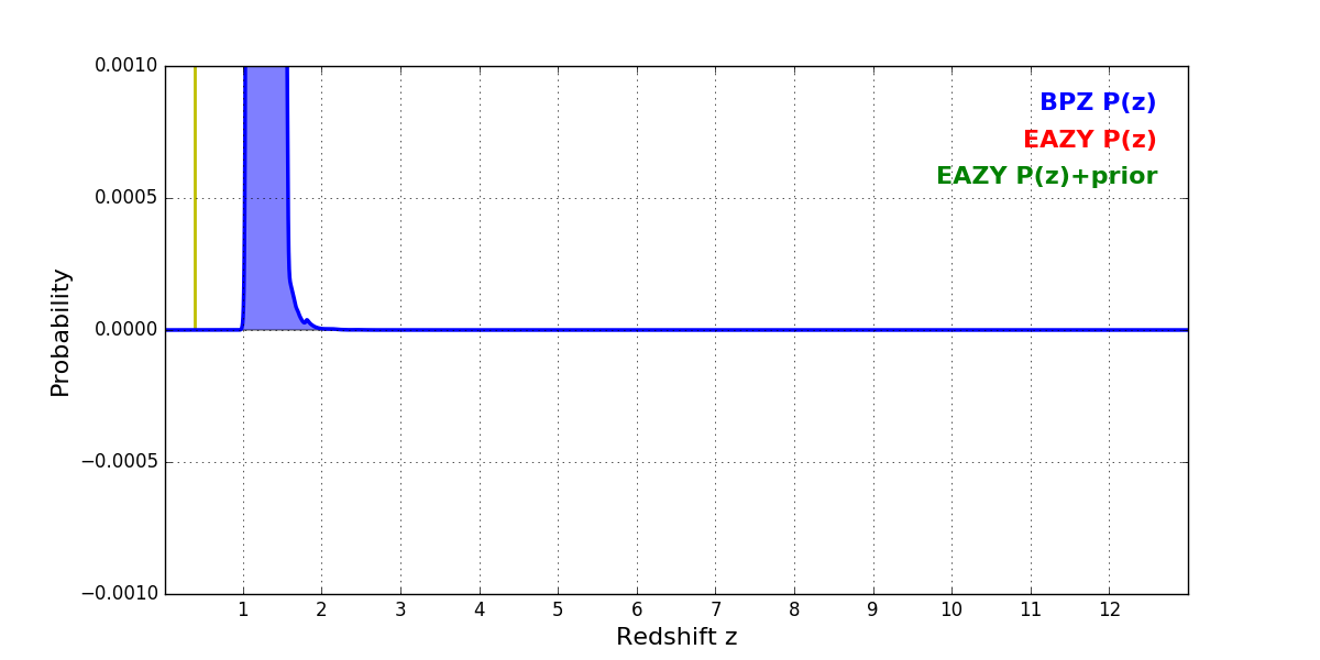 In P(z) plots: Yellow lines mark the cluster redshift z = 0.390,