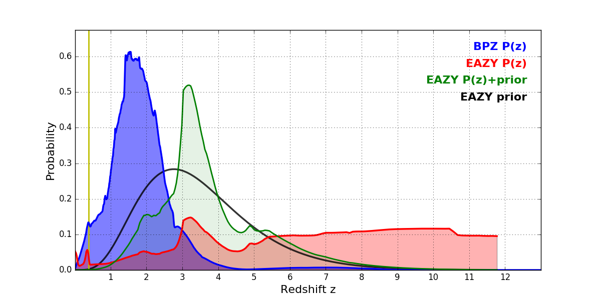 In P(z) plots: Yellow lines mark the cluster redshift z = 0.390,