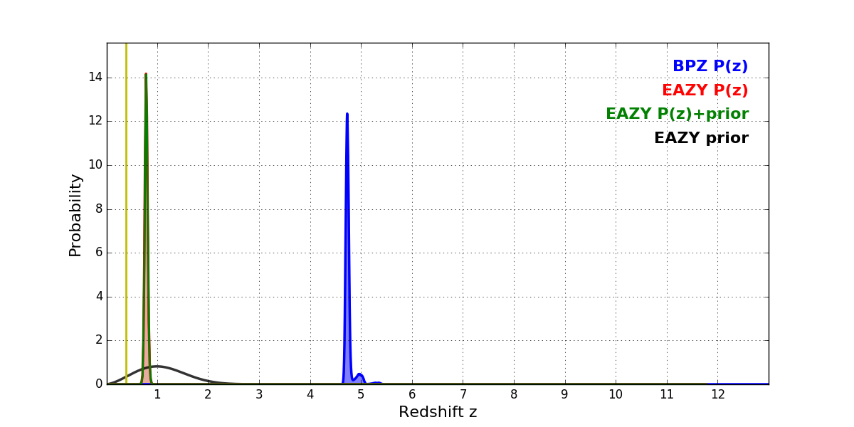 In P(z) plots: Yellow lines mark the cluster redshift z = 0.390,