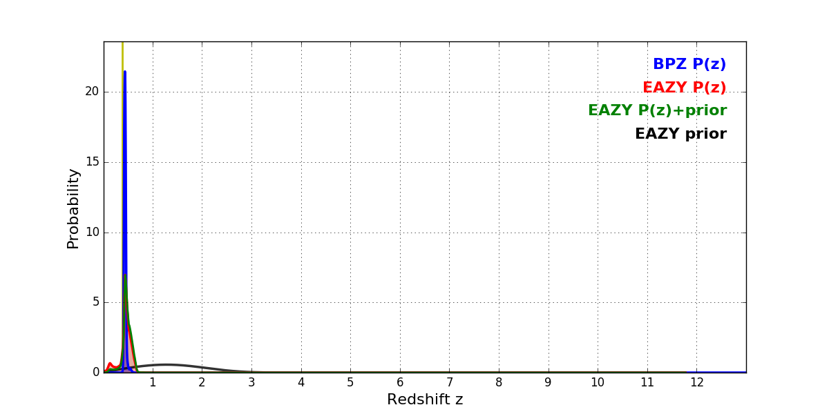 In P(z) plots: Yellow lines mark the cluster redshift z = 0.390,
