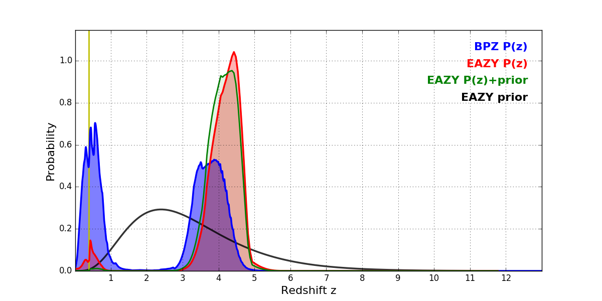 In P(z) plots: Yellow lines mark the cluster redshift z = 0.390,