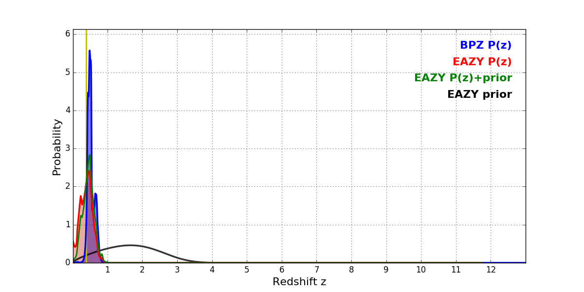 In P(z) plots: Yellow lines mark the cluster redshift z = 0.390,
