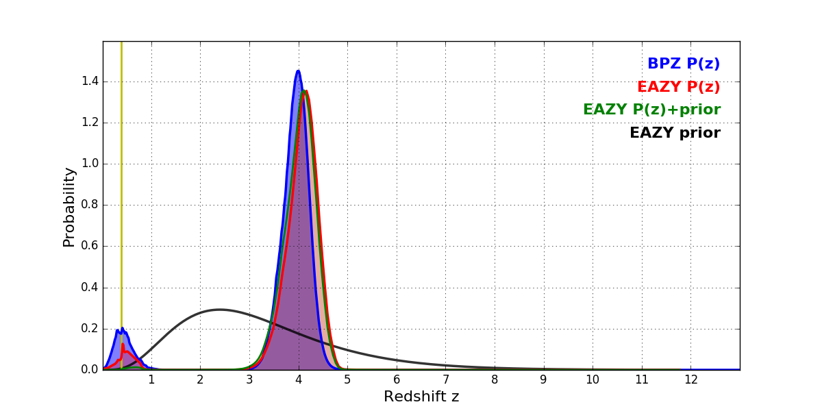 In P(z) plots: Yellow lines mark the cluster redshift z = 0.390,