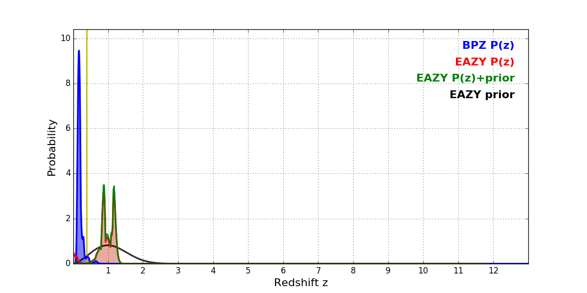 In P(z) plots: Yellow lines mark the cluster redshift z = 0.390,