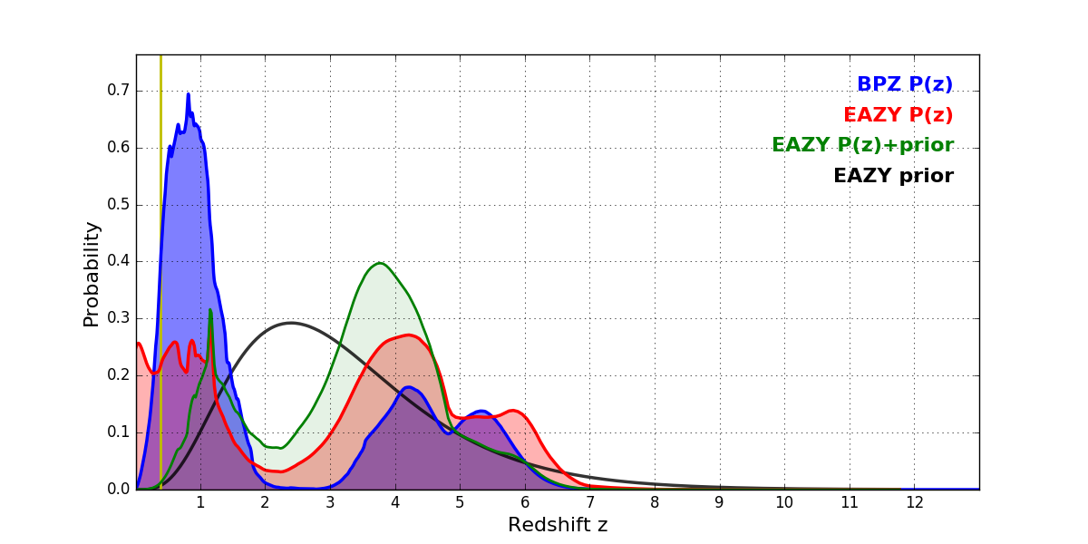 In P(z) plots: Yellow lines mark the cluster redshift z = 0.390,