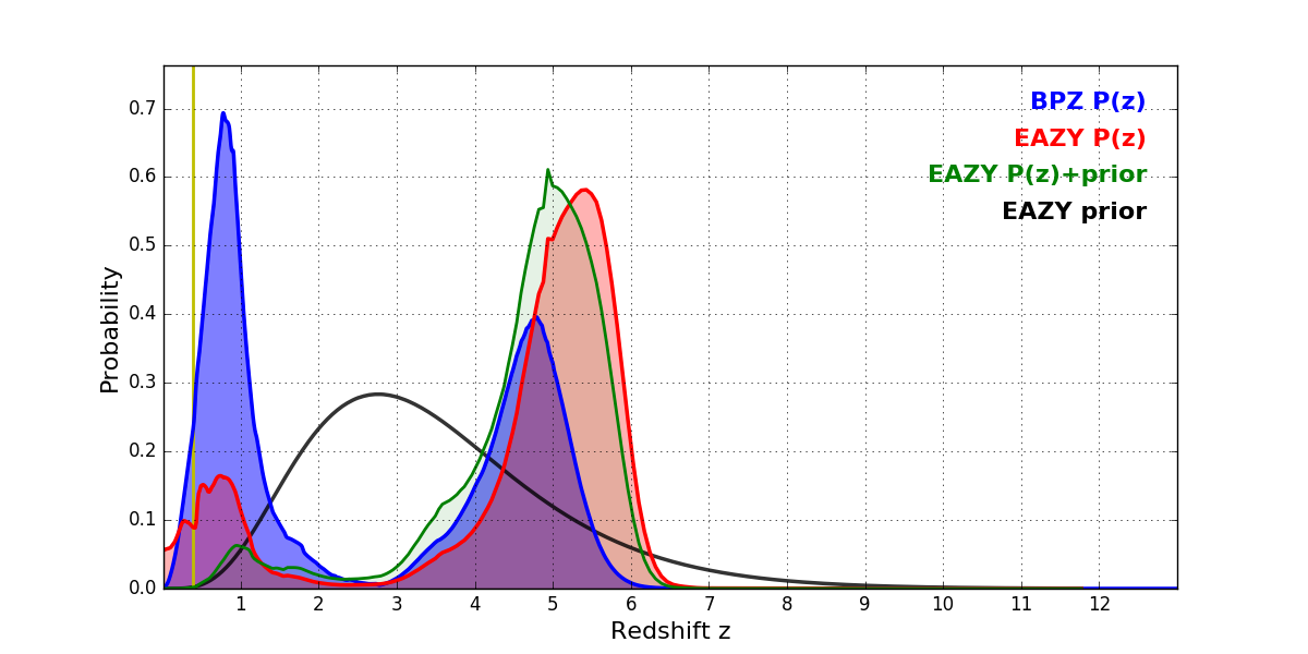In P(z) plots: Yellow lines mark the cluster redshift z = 0.390,