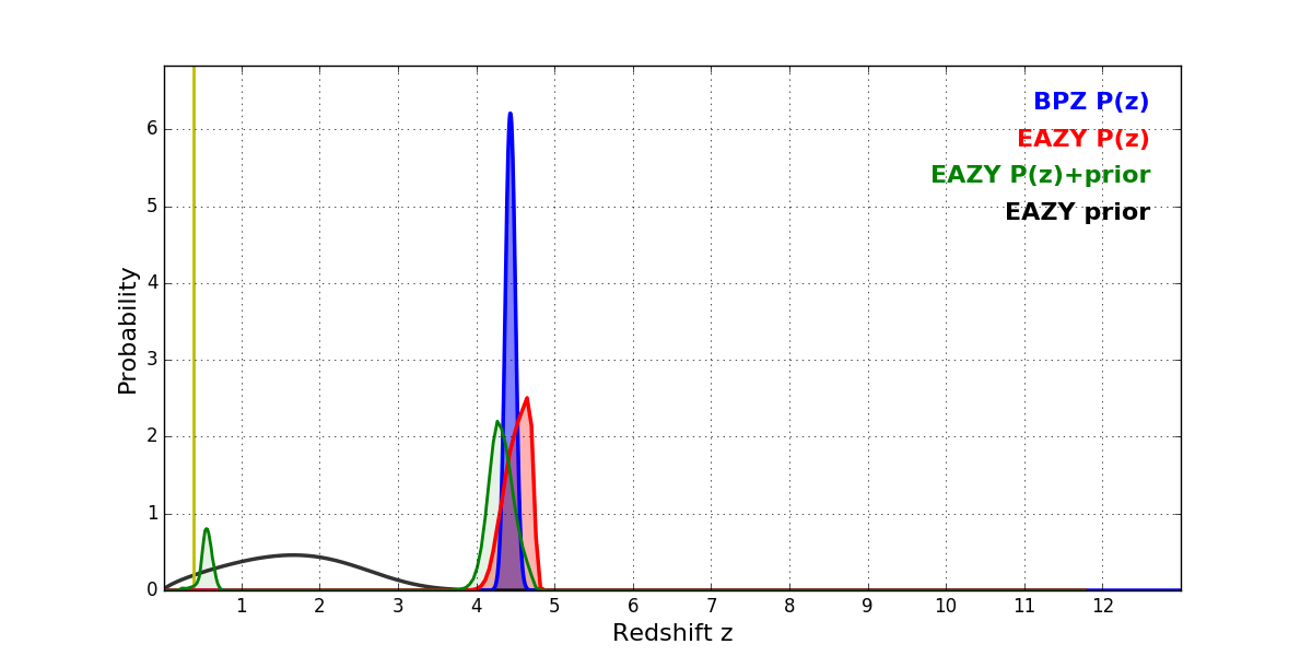 In P(z) plots: Yellow lines mark the cluster redshift z = 0.390,