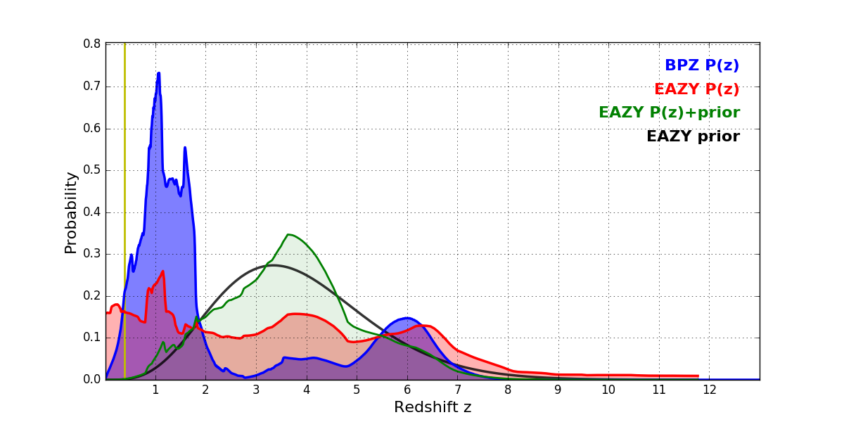 In P(z) plots: Yellow lines mark the cluster redshift z = 0.390,