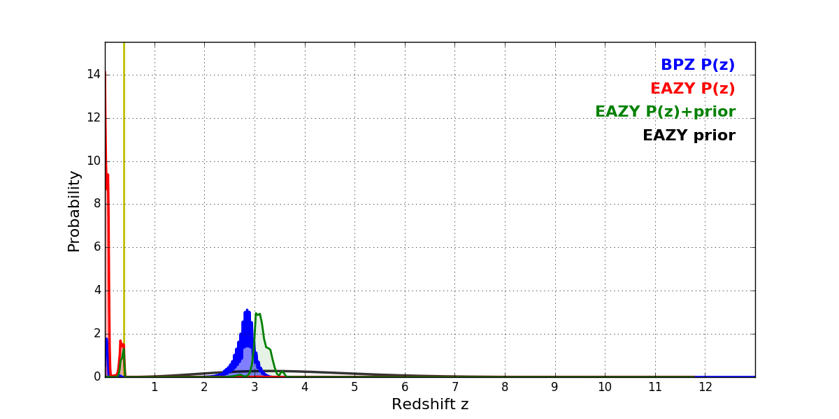 In P(z) plots: Yellow lines mark the cluster redshift z = 0.390,