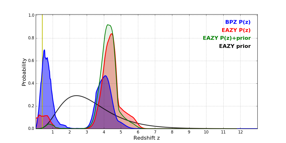 In P(z) plots: Yellow lines mark the cluster redshift z = 0.390,