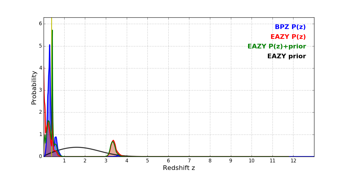 In P(z) plots: Yellow lines mark the cluster redshift z = 0.390,