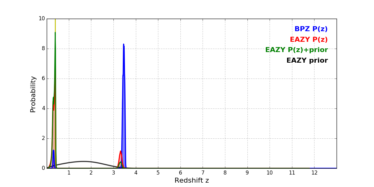 In P(z) plots: Yellow lines mark the cluster redshift z = 0.390,
