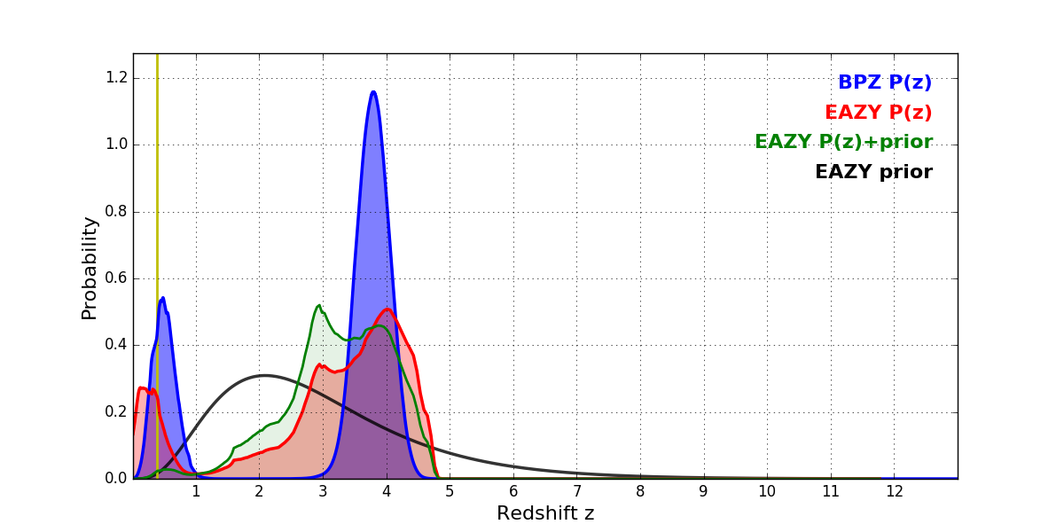 In P(z) plots: Yellow lines mark the cluster redshift z = 0.390,