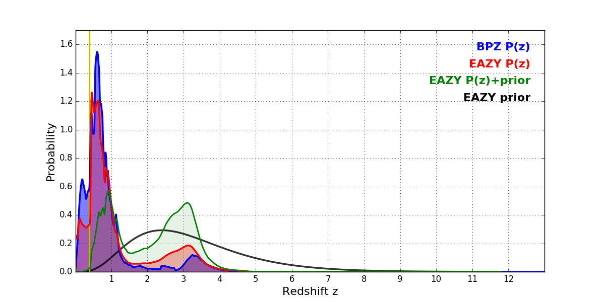 In P(z) plots: Yellow lines mark the cluster redshift z = 0.390,