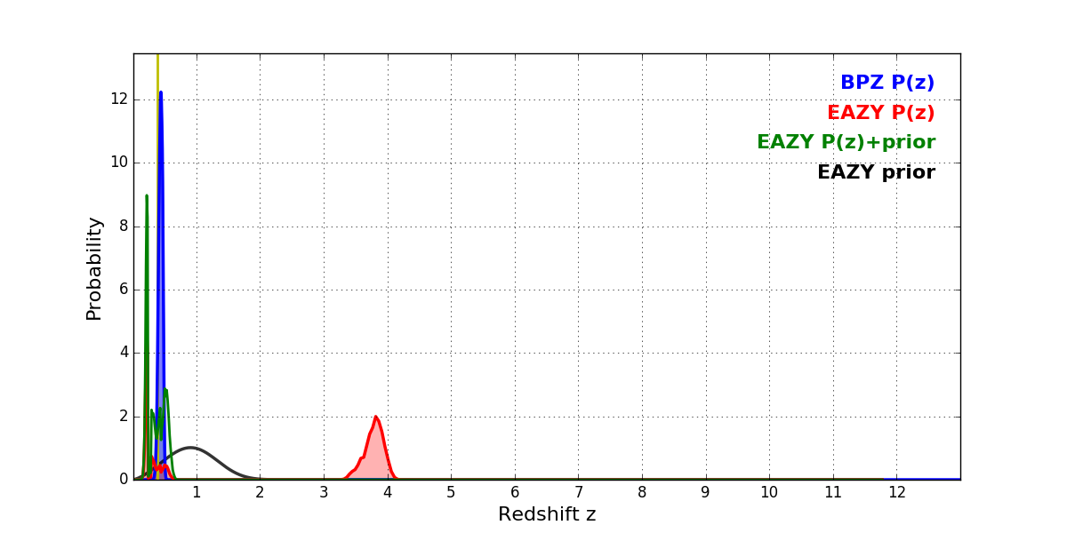In P(z) plots: Yellow lines mark the cluster redshift z = 0.390,