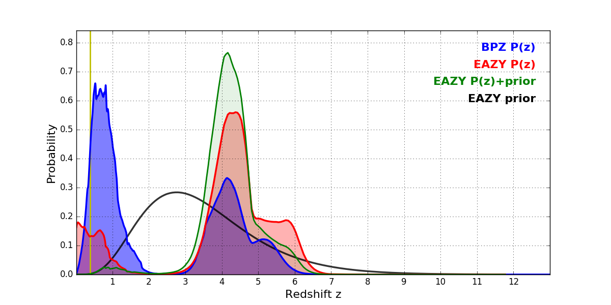 In P(z) plots: Yellow lines mark the cluster redshift z = 0.390,