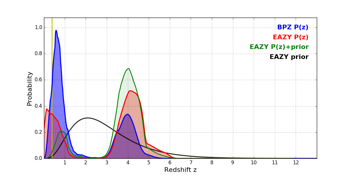 In P(z) plots: Yellow lines mark the cluster redshift z = 0.390,