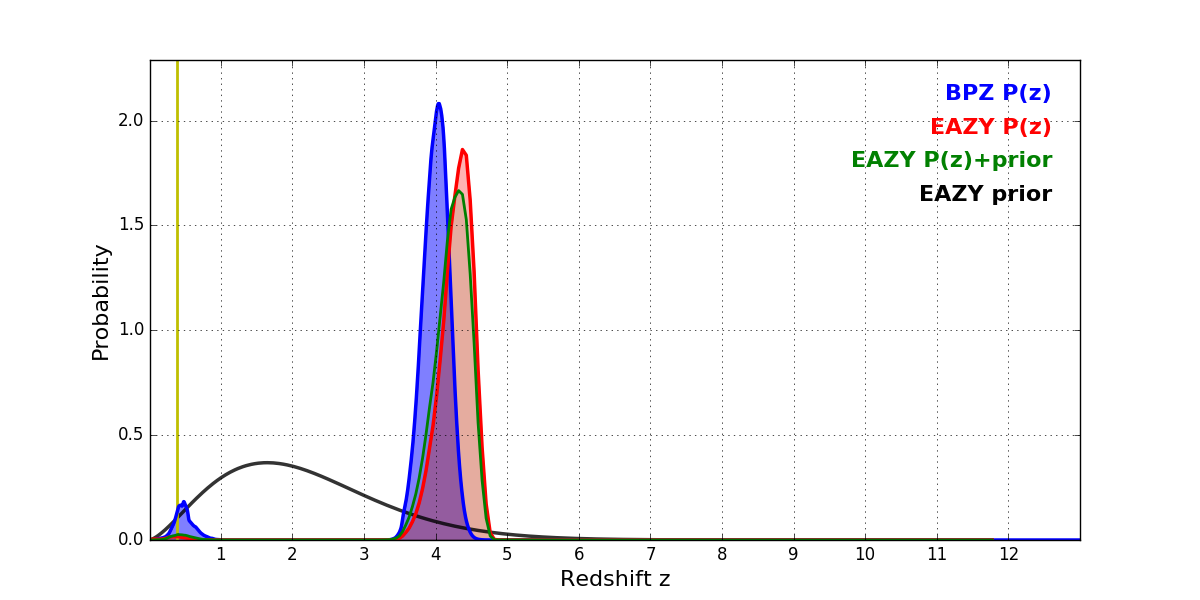 In P(z) plots: Yellow lines mark the cluster redshift z = 0.390,