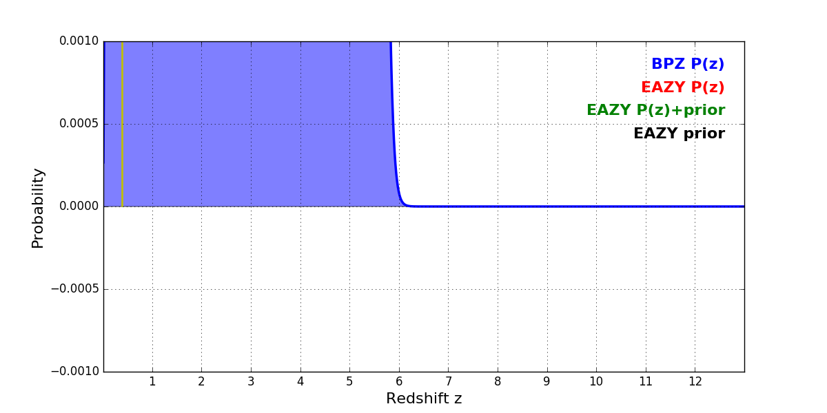 In P(z) plots: Yellow lines mark the cluster redshift z = 0.390,