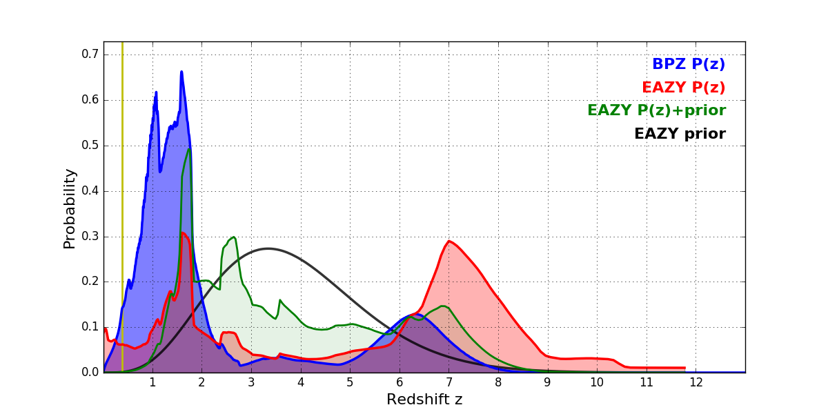 In P(z) plots: Yellow lines mark the cluster redshift z = 0.390,