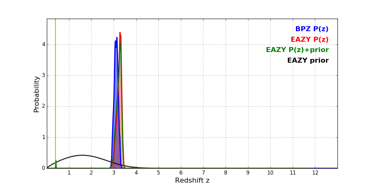 In P(z) plots: Yellow lines mark the cluster redshift z = 0.390,