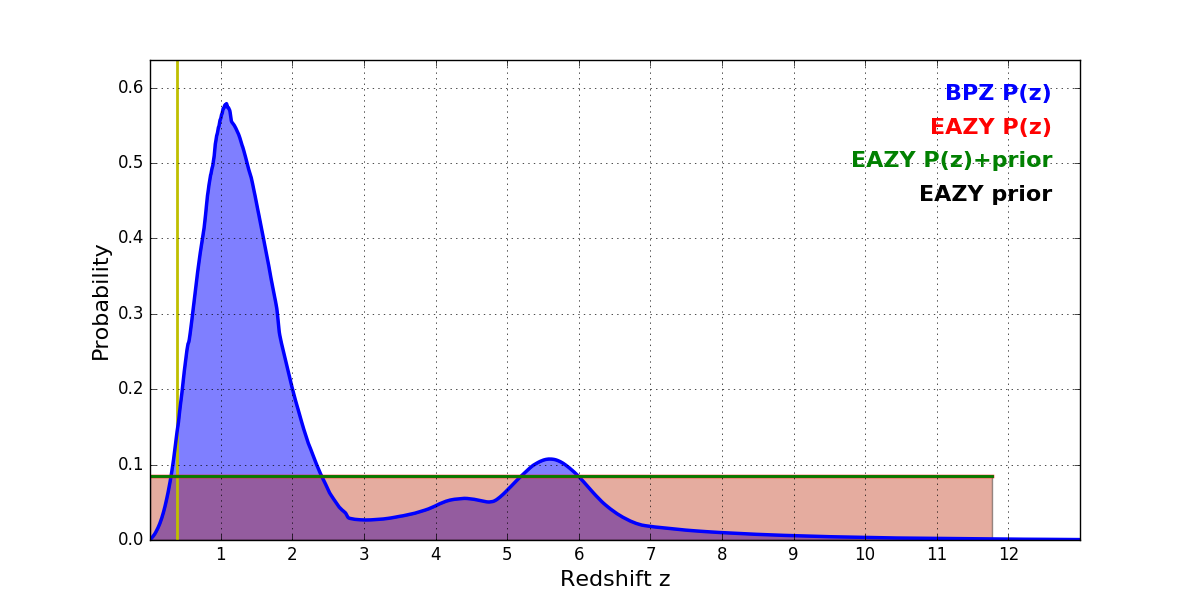In P(z) plots: Yellow lines mark the cluster redshift z = 0.390,
