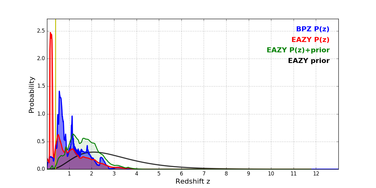 In P(z) plots: Yellow lines mark the cluster redshift z = 0.390,