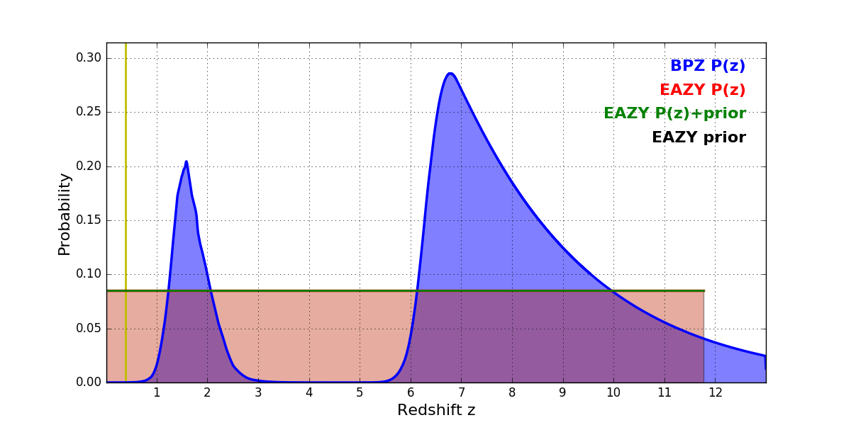 In P(z) plots: Yellow lines mark the cluster redshift z = 0.390,