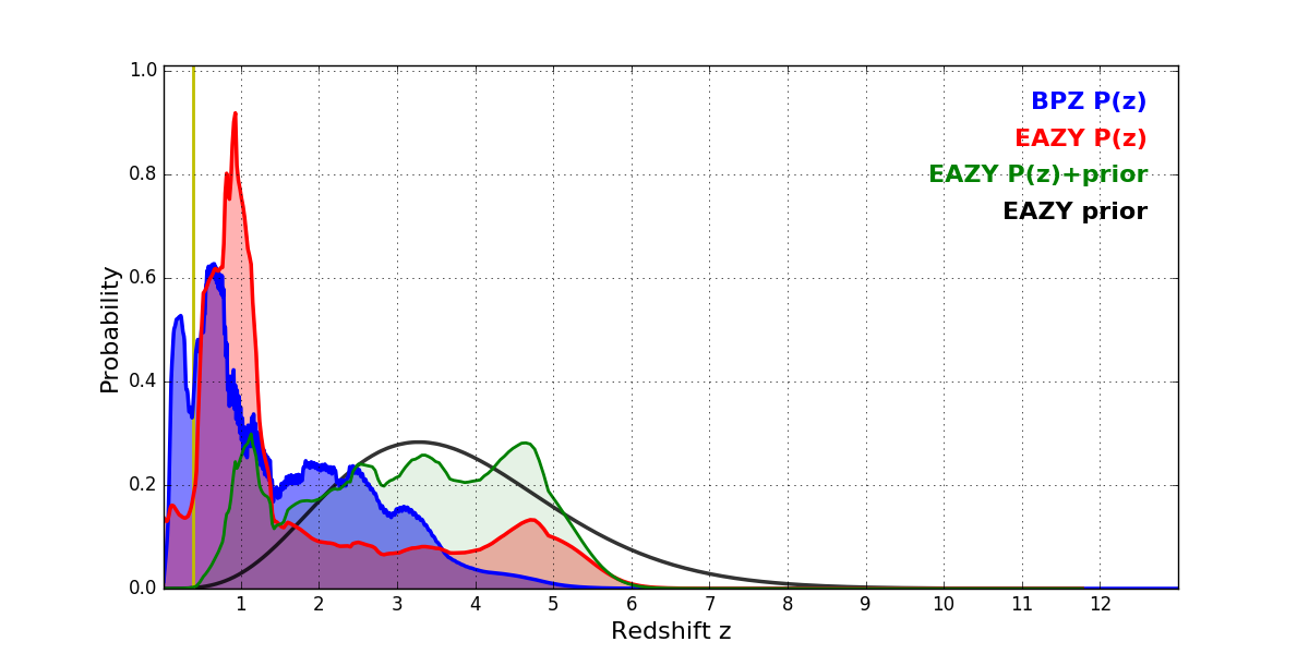 In P(z) plots: Yellow lines mark the cluster redshift z = 0.390,
