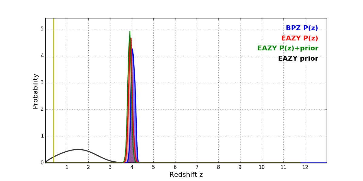 In P(z) plots: Yellow lines mark the cluster redshift z = 0.390,