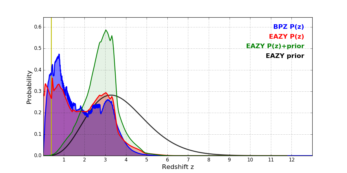 In P(z) plots: Yellow lines mark the cluster redshift z = 0.390,