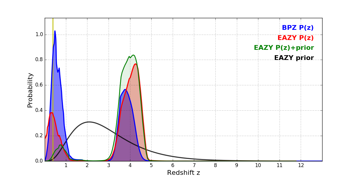 In P(z) plots: Yellow lines mark the cluster redshift z = 0.390,