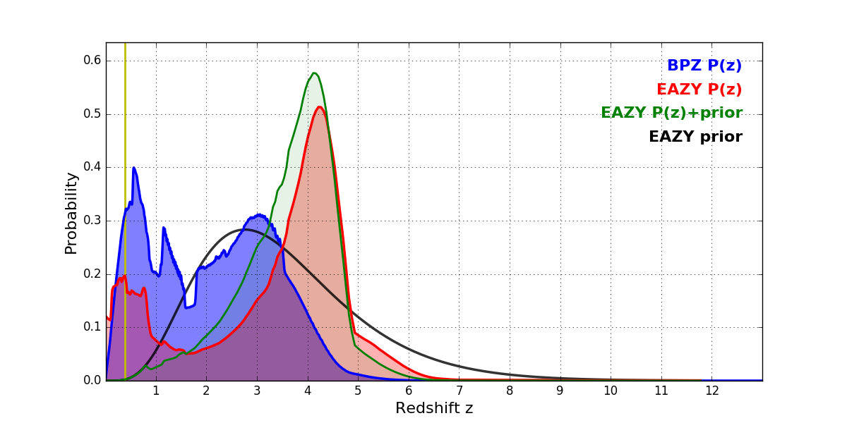 In P(z) plots: Yellow lines mark the cluster redshift z = 0.390,