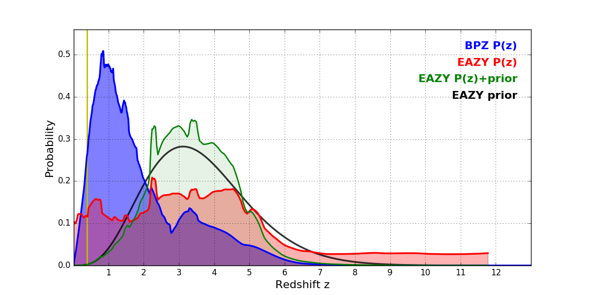 In P(z) plots: Yellow lines mark the cluster redshift z = 0.390,