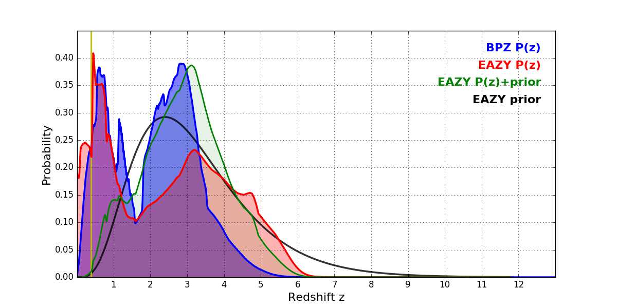 In P(z) plots: Yellow lines mark the cluster redshift z = 0.390,
