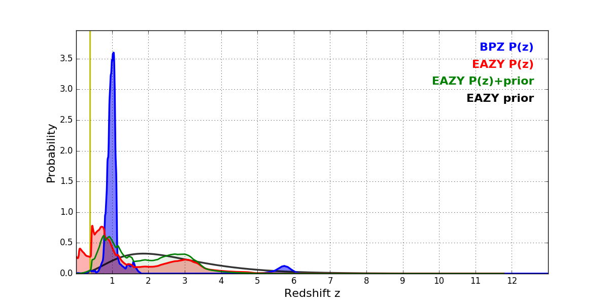 In P(z) plots: Yellow lines mark the cluster redshift z = 0.390,