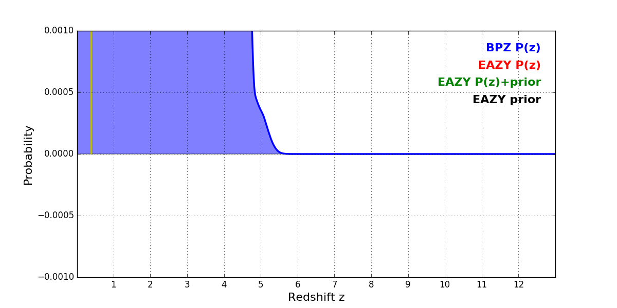 In P(z) plots: Yellow lines mark the cluster redshift z = 0.390,