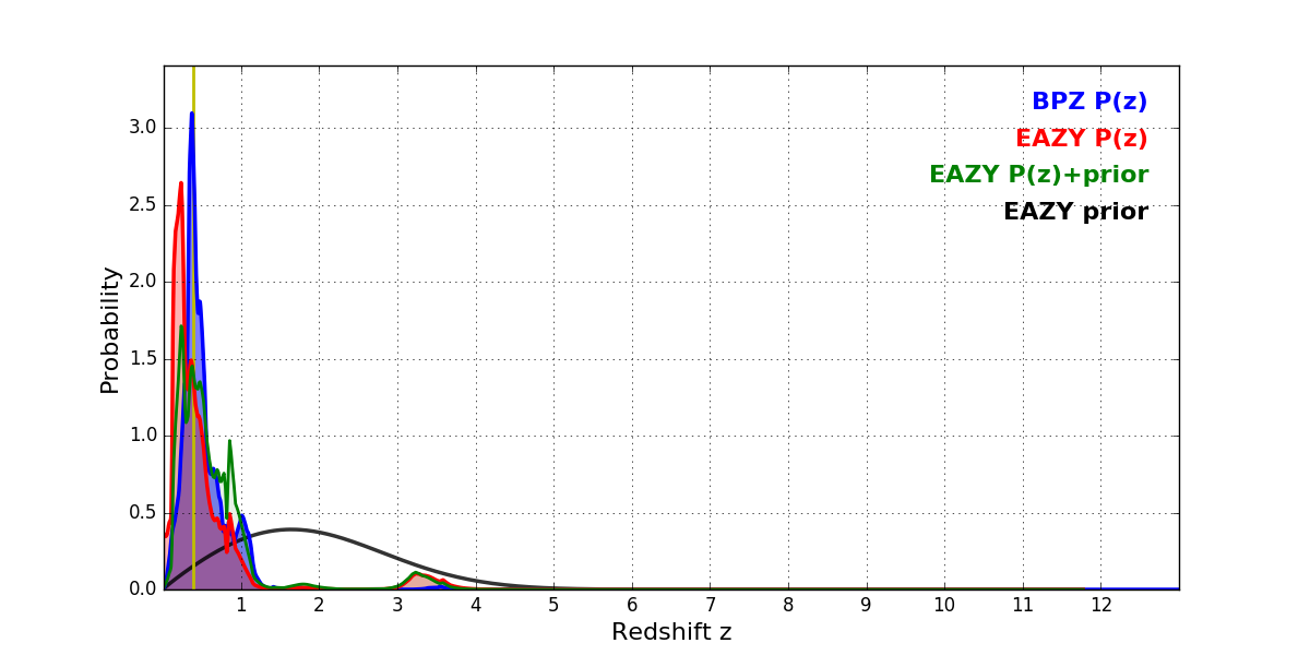 In P(z) plots: Yellow lines mark the cluster redshift z = 0.390,