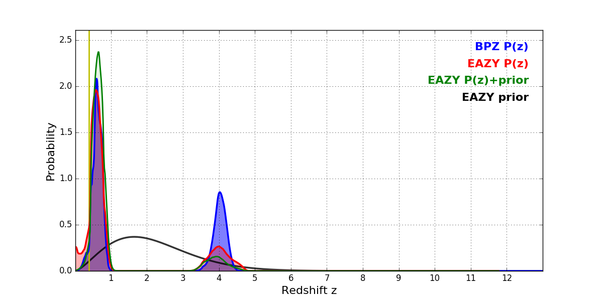 In P(z) plots: Yellow lines mark the cluster redshift z = 0.390,