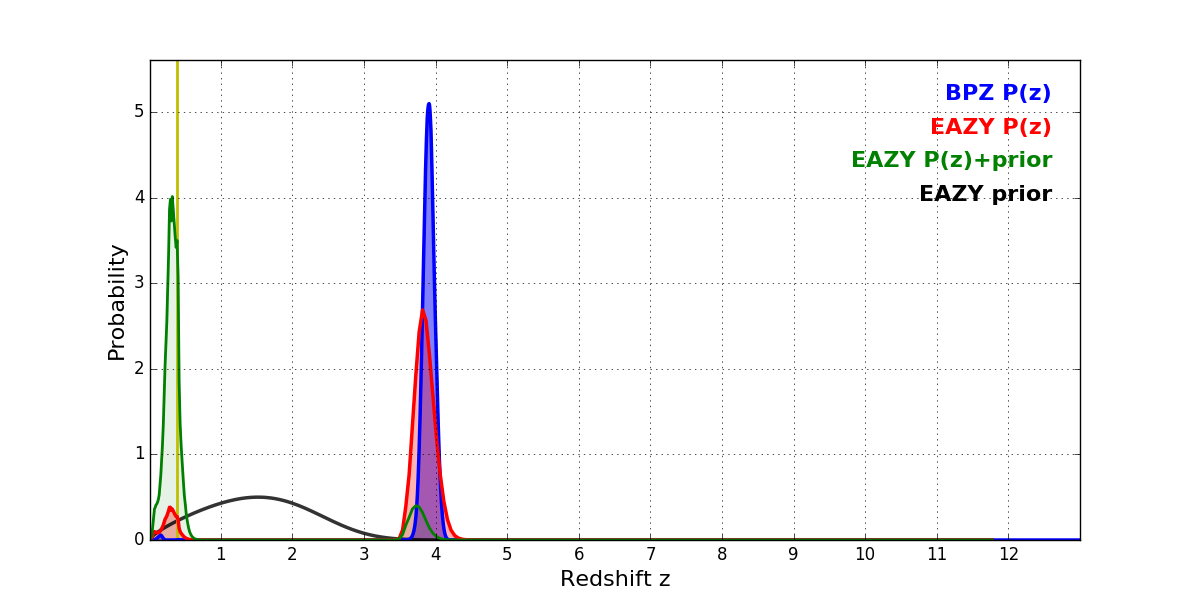 In P(z) plots: Yellow lines mark the cluster redshift z = 0.390,