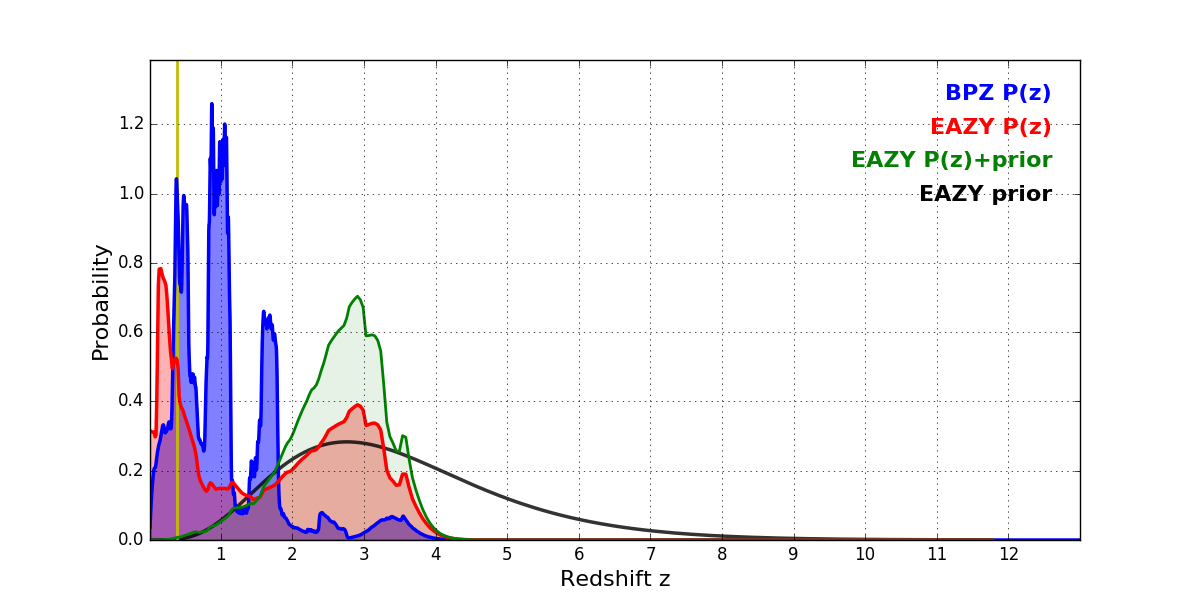 In P(z) plots: Yellow lines mark the cluster redshift z = 0.390,