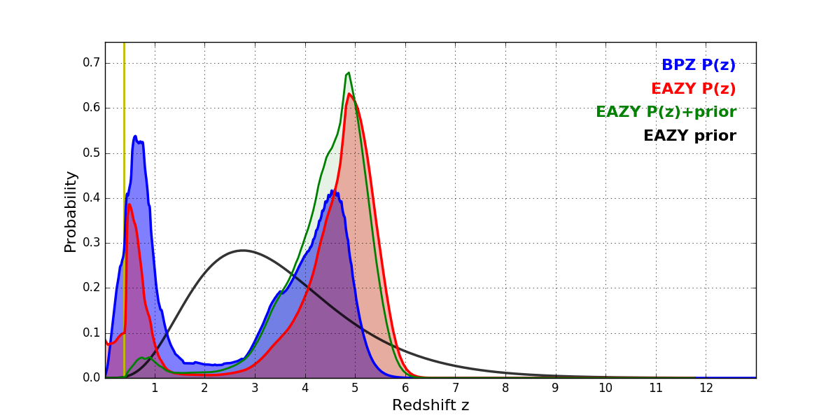 In P(z) plots: Yellow lines mark the cluster redshift z = 0.390,