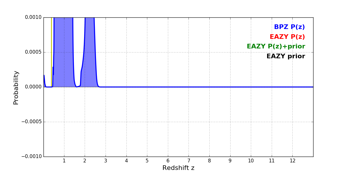 In P(z) plots: Yellow lines mark the cluster redshift z = 0.390,