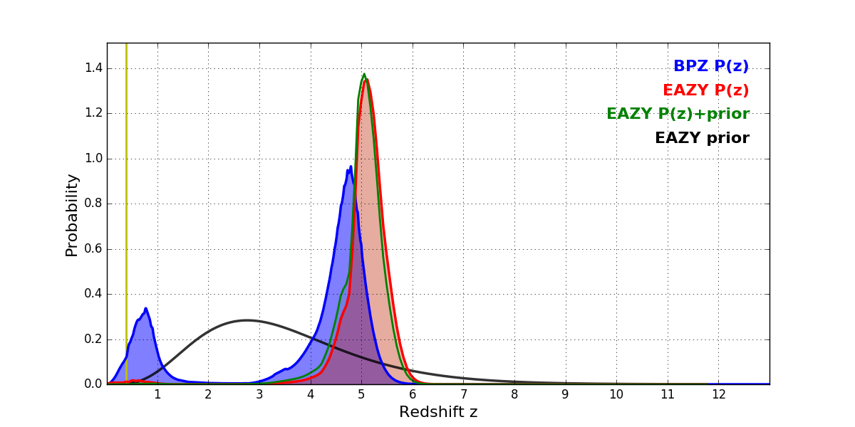In P(z) plots: Yellow lines mark the cluster redshift z = 0.390,