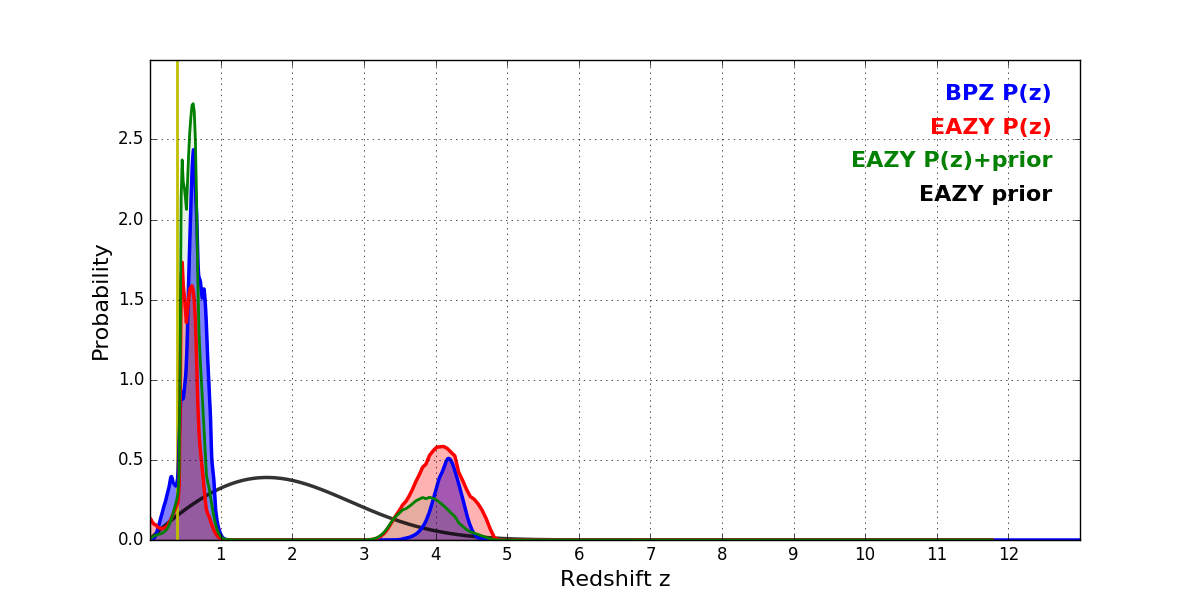 In P(z) plots: Yellow lines mark the cluster redshift z = 0.390,