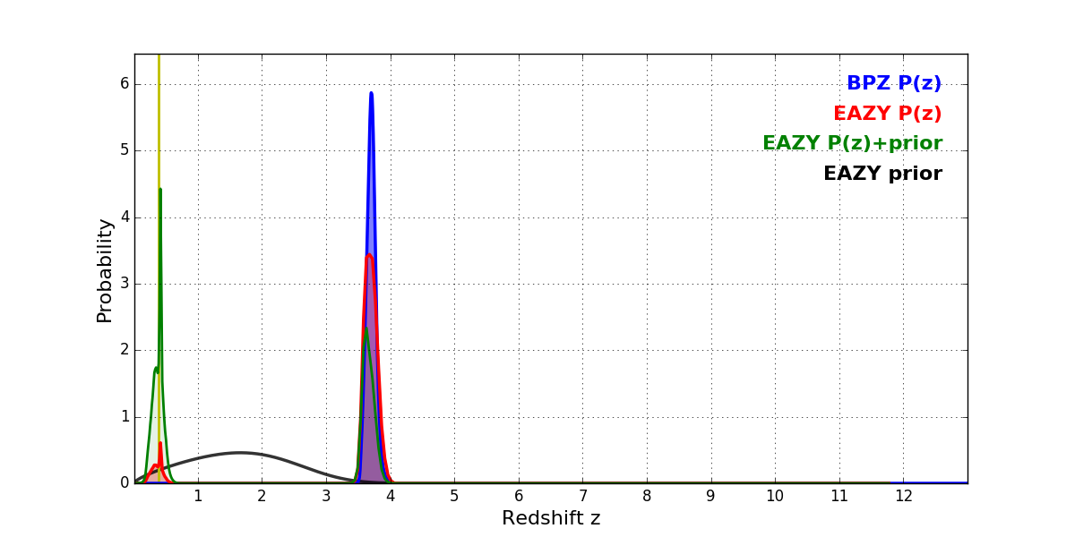 In P(z) plots: Yellow lines mark the cluster redshift z = 0.390,