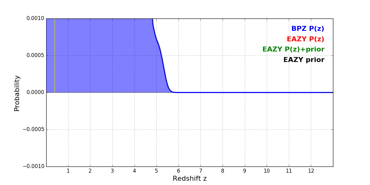 In P(z) plots: Yellow lines mark the cluster redshift z = 0.390,