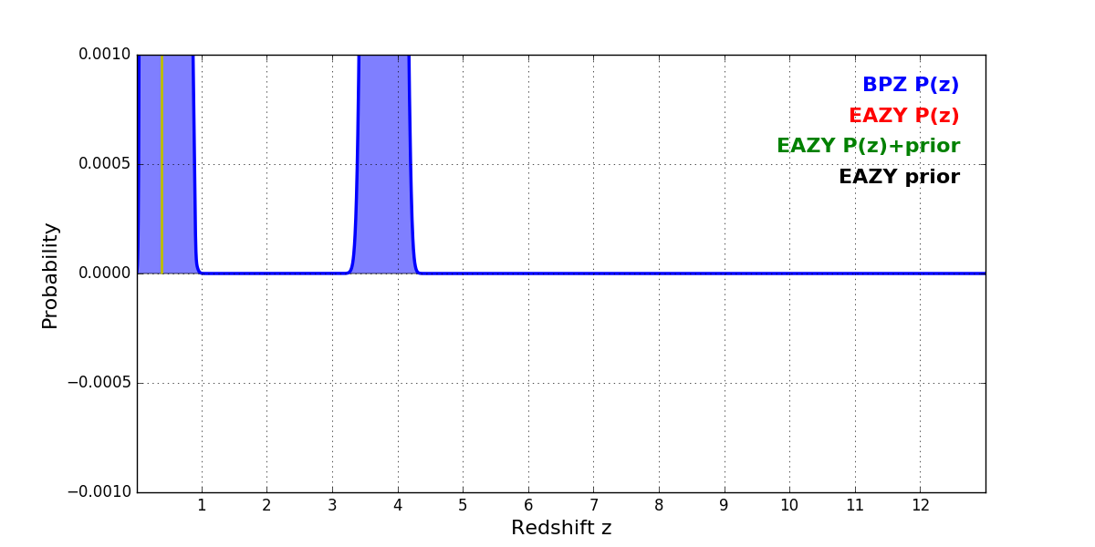 In P(z) plots: Yellow lines mark the cluster redshift z = 0.390,